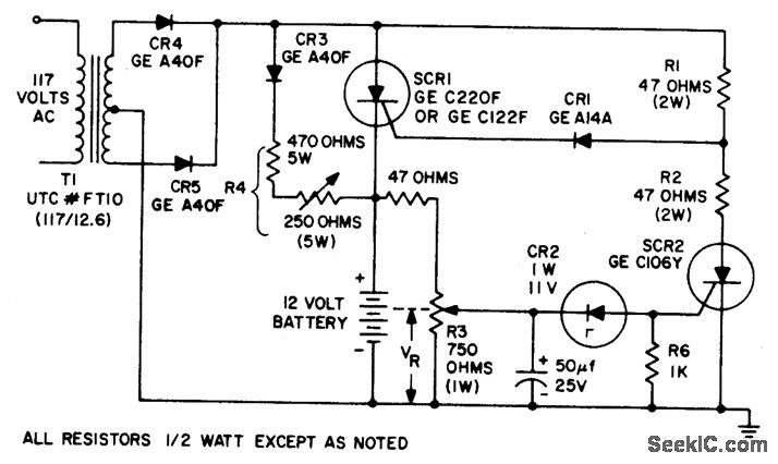 The circuit is capable of charging a 12 volt battery at up to a six ampere rate. Other volt-ages andcurrents, from6 to600volts and upto 300 amperes, can be accommodated by suitable component selection. When the battery voltage reaches its fully charged level, the charging SCR shuts off, and a trickle charge as deter-mined by the value of R4 continues to flow.