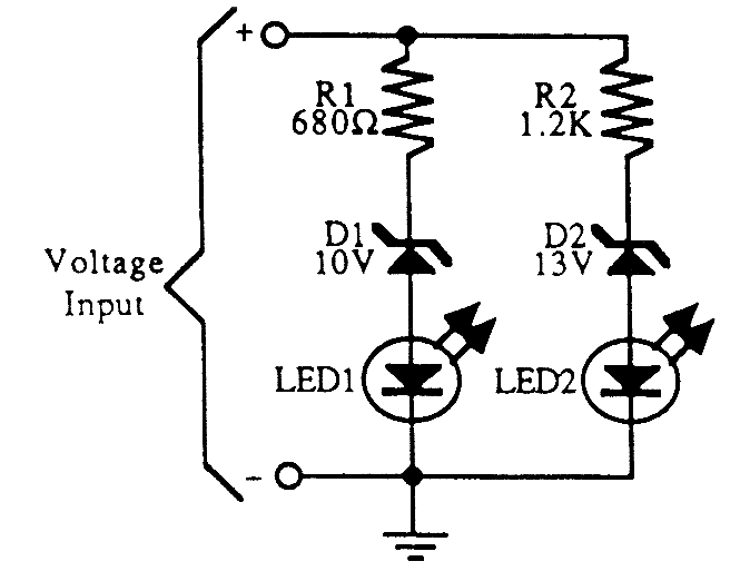 A simple battery condition indicator. Choose the Zener diodes to provide a window for over/un-der voltage indication.
