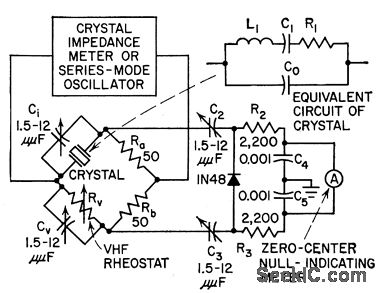 Bridge plugs into crystal socket of standard crystal impedance meter, and crystal under test plugs into bridge. Only other instruments needed for measuring equivalent parameters of overtone crystals for 75 to 200 Mc are frequency meter and null-indicating meter.-D. W. Robertson, Plug-in Bridge Checks VHF Quartz Crystals, Electronics, 31:19, p 82-85.