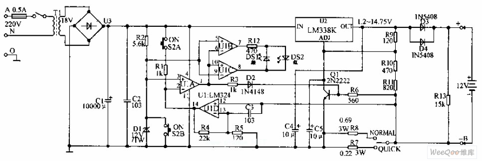 Lead accumulator charger circuit is shown in the above picture. The charger adopts constant voltage type charging. It controls the end of charging by the reduction of the charging current brought by the gradually adequate battery power. There is no need to worry about over-charging or lack of charging. When the power is on, the level of U1A inverting end , pin2, is always lower than the non-inverting input end, pin3. Therefore, pin 1 of U1A outputs high level, which makes Q1 saturate and conducted. It is as effective as the grounding of pin ADJ of U2, and the output of U2 is 1.2V with the charging end of 0.6A. It presents light load under such circumstance, and DS2 green luminous diodes is lighted. When the button S2 is pressed down, pin3 of U1A is grounded, pin2 is connected with the positive pole of the power via R1, then the U1A outputs low level, DS2 red luminous diode is lighted, and DS1 goes out.