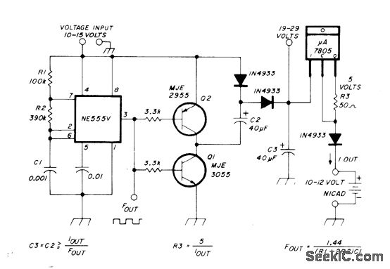 Voltage doubler provides at least 20 V from 12-V auto battery, for constant-current charging of 12-V nicads, using NE555 timer and two power transistors. Doubled voltage drives source current into three-terminal current regulator. Switching frequency of NE555 as MVBR is 1.4 kHz. Charging currentis set at 50 mA for charging ten 500-mAh nicads.-G. Hinkle, Constant-Current Battery Charger for Portable Operation, Ham Radio, April 1978, p 34-36.