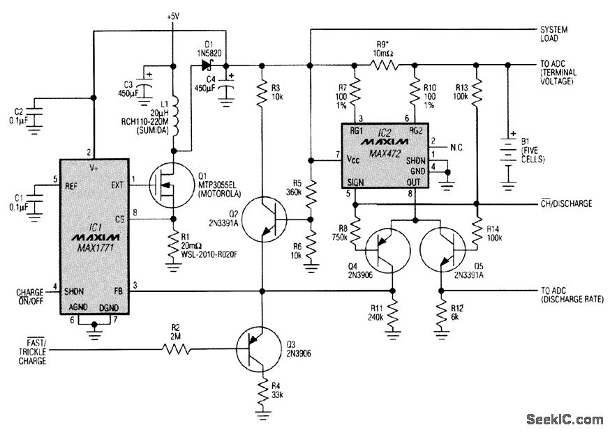 IC1 is a step-up switching regulator that boosts Vin (nominally 5 V) as necessary to supply the combination of charging current and load current. The 5-V source must include short-circuit protection. IC2 is a high-side current-sense amplifier that monitors the charging current. Commands from the processor include. CHARGE ON/OFF and FAST/TRICKLE CHARCGE. IC2 produces an output current (OUT) equal to 10-4 of the current through sense resistor R9. Q3 and Q4 are on during a fast-charge operation, so this output current flows through the parallel combination of R11 and (approximately) R4. The resulting feedback to IC1 (pin 3) maintains the fast-charge current through R9 at 500 mA. This feedback also enables the regulator to supply as much as 500 mA of load current in addition to the fixed 500 mA of charging current. Q2 limits the battery voltage to 10 V (2 V/cell). During the fast charge, an external processor and multichannel A/D converter (ADC) must monitor the battery's terminal voltage. When the ADO senses a change of slope in this voltage, the processor terminates the fast charge by asserting a high on FAST/TRICKLE CHARGE. Q3 turns off, causing a rise in the feedback (FB) that lowers the charging current to the trickle charge rate (approximately 60 mA). If IC1 shuts down or if the load current plus charging current exceeds the capability of IC1, the R9 current reverses as current flows out of the battery. IC2 indicates the reversal by allowing R13 to pull its open-collector SIGN output high, turning off Q4 and turning on Q5. Current through R12 then produces a voltage proportional to the battery's discharge current (5 A through R9 produces a full-scale response of 3 V across R12). By integrating this voltage over time (sampling at fixed intervals and multiplying by the time interval), the A/D-processor system can monitor energy removed from the battery. Based on this measurement and the terminal-voltage measurement, the processor can then reinitiate a fast charge (by asserting FAST/TRICKLE CHARGE low) before the battery reaches its end of life.