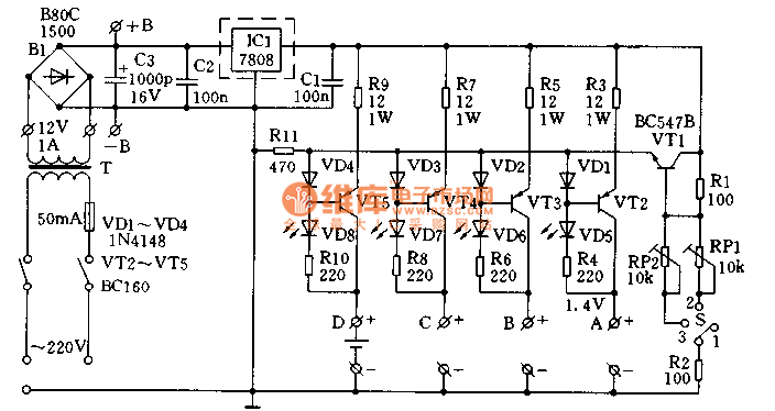The circuit is shown in diagram 2-2. It consists of three terminal regulator 708 and four loads current source composed of triode VT2~VT5. VT1 and corresponding adjustable resistance RRP1, RP2 and switching tube S is used to control each roads charging current. When S is placed on position 1, charging current of each roads is 90mA; when S placed 2 and 3, it can get 100mA~300mA charging current by adjusting RP1 and RP2. If it adopts current above 200mA to charge, each triode should add radiator. Light emitting diode VD5~VD8 in diagram 2-2 is used as charge indicator. Whole circuit can supply by 220V mains, it also can supply by 12V storage battery. Charge time can count according to the following formula: