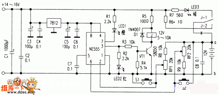 The core part of the circuit is composed by NE555 hysteresis comparator . R8, R9, RP1 and RP2 constitute sampling circuit and LED1-LED3 is an indicator for charging status. The charger of the battery is connected with an electrical relay, leading the cutting-off to be more reliable. S1 and S2 are touch switched, which are used to manually control the charging process. As a result, the circuit becomes more flexible and more convenient.