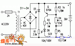 The AC220V electricity is stepped-down through transformer T1 and is regulated through the full-wave rectifier D1-D4. Thus the charging circuit is supplied to work. Then the output end is correctly accessed to the set recharged bottle. If each half-wave peak value of the rectifier output ripple voltage is higher than the output voltage of the battery, the thyristor SCR is triggered to conduct by the Q collector current. The current charges the battery through the SCR. When the pulsating voltage is close to battery voltage, the SCR is off and charging process stops. Conduction voltage for transistor Q can be adjusted by the regulation of R4. The R4 is generally adjusted, from large value to small value, to trigger SCR. LED D5 in the figure is used for the power indicator and D6 is used for charging instructions.