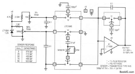 This circuit produces a 0- to 1.00-V output in response to a sensed 0 to 100% relative humidity (RH), and operates from a 9-V battery. To calibrate, place the sensor in a 5% RH environment, and set the 5% RH trim for 50 mV at the output. Then, place the sensor in 90% RH and set the 90% trim for 900-mV output.Repeat as necessary. If the known RH environments are not available, the capacitance-versus-RH table in Fig. 12-35 can be used (although the table applies to an ideal sensor). The capacitor values can be built-up or directly dialed on a precision variable air capacitor (General Radio #722D). Linear Technology Corporation 1991 AN45-10