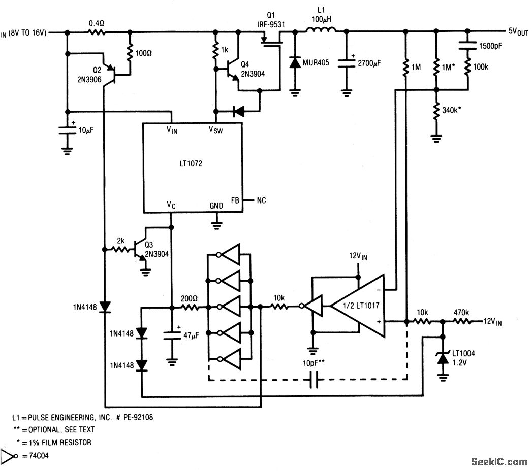 This circuit provides 5-V output for 8- to 16-V input, with about 10-mA quiescent current.