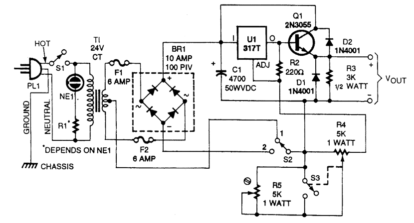 This supply has a variable output voltage feature and a dual voltage switch, S2. Q1 should be ad-equately heatsinked.