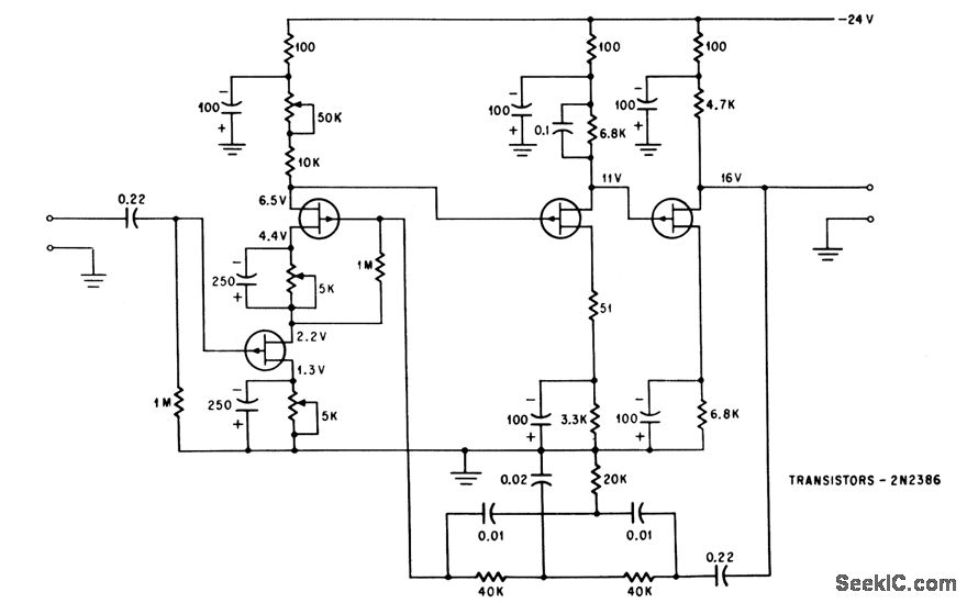 Gives gain of 600 when used as null detector of 400-cps impedance bridge, with measuring accuracy of one part per million.-W. A. Rhinehart and L. Mourlam, FET Performs Well in Balancing Act, Electronics, 38:19, p 88-92.