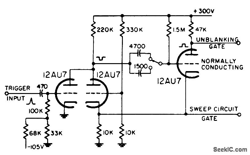 Provides positive unblanking gate. Used in radar to provide gate during which display sweep is generated. Capacitor switching provides choice of pate lengths.-NBS, Handbook Preferred Circuits Navy Aeronoutical Electronic Equipment, Vol. 1, Electron Tube Circuits, 1963, p N10-2.