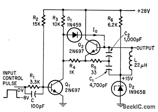 Pulsed oscillator, used in producing alphanumeric display characters from combinations of circles, half-circles, and ellipses, is transient-free. Sinusoidal oscillator Q2 starts with full amplitude and stops in less than one cycle.-A. E. Popodi, Reliable Repertoire Of Display Circuits, Electronics, 38:2, p 60-66.