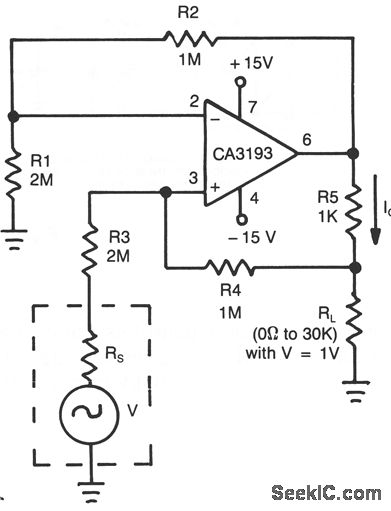 It is usually desirable to have the remote transmitter of a 4 to 20 mA current loop system powered directly from the transmission line. In some cases, this is not possible because of the high-power requirements set by the remote sensor/transmitter system. In these cases, an alternative to the separate power supply is still possible. If the remote transmitter can be operated in a pulsed mode where it is active only long enough to perform its function, then a charge pool power supply can still allow the transmitter to be powered directly by the current loop. In this circuit, constant current I1 is supplied to the charge pool capacitor, CP, by the HA-5141 (where I1 = 3 mA). The voltage V1 continues to rise until the output of the HA-5141 approaches + VS or the optional voltage limiting prodded by Z2. The LM2931 voltage regulator supplies the transmitter with a stable +5 V supply from the charge collected by CP. Available power supply current is determined by the duration, allowable voltage droop on CP, and required repetition rate. For example, if F1 is allowed to droop 4.4 V and the duration of operation is 1 ms, the available power supply current is approximately: