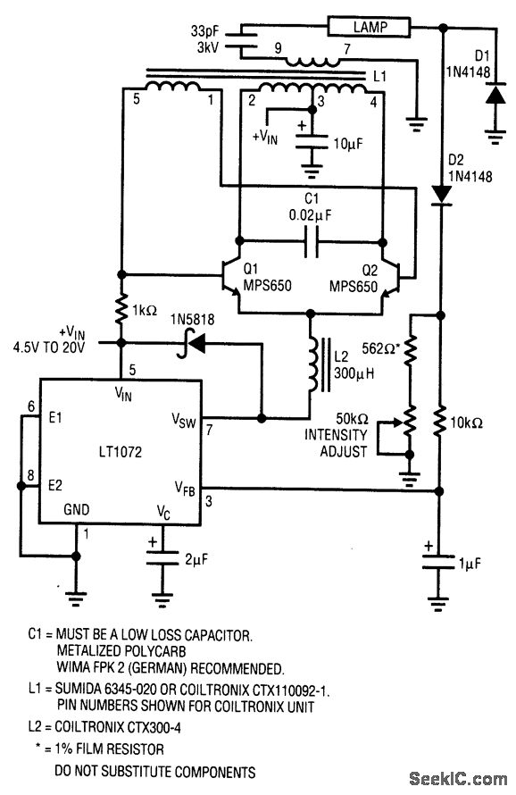For back-lit LCD displays,this supply will drive a lamp. LT1072 drives Q1 and Q2,and a slne waveappears across C1. L1 is a transformer that steps up this voltage to about 1 400 V D1 and D2 detect lampcurrent and form a feedback loop to the LT1072 to control lamp brightness.