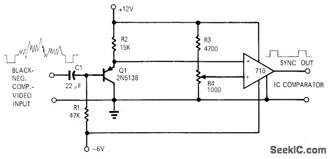 By setting DC reference input of 710 comparator at 0.15 CDC.only horizontal sync pulses are extracted from composite black-negative video signal to appear at comparator output Setting reference level at 0.35 VDC gives only blanking pulses at output.-R,G, Groom IC Comparator Separates Sync Pulses EDN Magazine, Sept 15.1970.p 53-54.