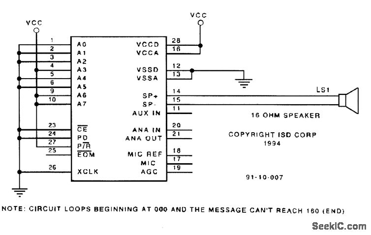 This requires a prerecorded message to be preprogrammed in the ISD1020A. If you want a message to repeat over and over again, automatically, the circuit in the figure will do the trick. It uses the Operation mode to accomplish playback looping as long as the message starts at address 0 (the beginning of the memory) and does not require the full 20 seconds of analog storage. A message is first recorded into an ISD1020A using the Yack/Yack project, with all address bits tied low. Next, connect the circuit in the figure. Note that address bits A6 and A7 are tied high to enable the Operation mode. Bit A3 is also tied high to enable continuous repeat. With PD low, P/R high, and CB held low, the beginning message in the ISD1020A will repeat.