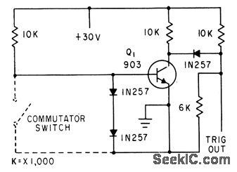Base of Q1 is grounded once during each revolution by commutator segment of gyro balancer, to make circuit produce sharp pulse that triggers oscilloscope sweep.-F. W. Kear, Electronic System for Balancing Gyro Wheels, Electronics, 33:43, p 82-85.