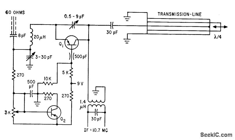Circuit permits operation of transistors beyond rated frequency limit. Transistor is used as negative-feedback oscillator whose frequency is determined by length of coaxial line. Operation is similar to that of parametric amplifier.-U. L. Rohde, Pushing Transistors Above Their Frequency Limits, Electronics, 35:25, p 46-49.