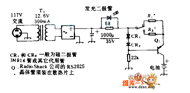 In this circuit, R1 is the 10Ω resistance, R2 is the 200Ω resistance. When the switch closes up, the charging current is 60mA (constant-current); when the switch closes down, the charging current is 3mA (constant-current). The total pressure drop of the silicon diode CR1 and CR2 are 1.2V, but Q1's launch pressure drop is 0.6V, so R1 or R2's net pressure drop is 0.6V. The 0.6V is divided by the required charge current, we get the resistance of R1 or R2. The LED indicates the charging circuit's working state.