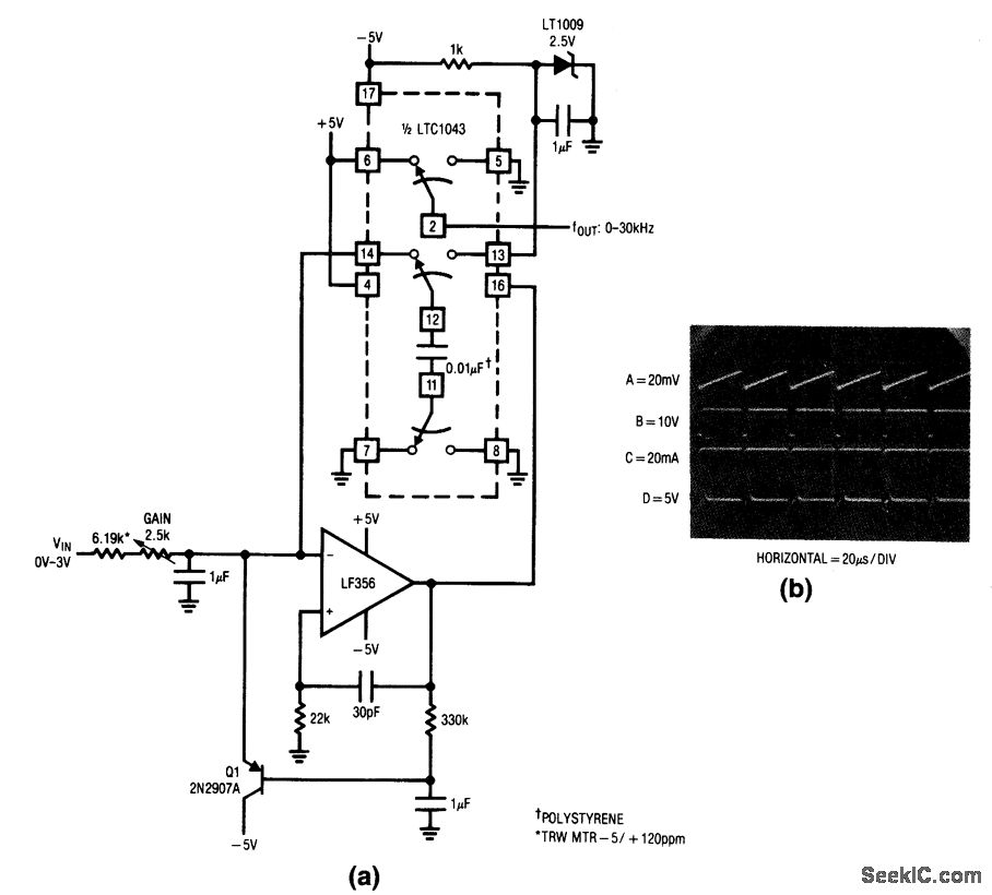 Fig. 12-2 In this circuit, the voltage input is applied to the noninverting input of the LF356, and the LTC1043 is connected in the LF356 feedback loop. This results in a V/F where the oscillation frequency is directly related to input voltage with a transfer linearity of 0.005%. To trim, apply 3.0 V, and adjust gain trim for a 30-kHz Output. Linear Technology, Linear Applications Handbook , 1990 p. AN3-11.