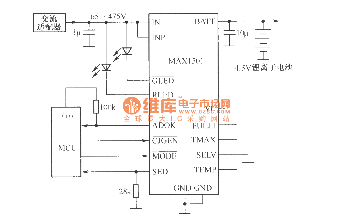 MAX1501 is a new type charge chip, it adopts MAX1501 torealize charger's simple design. MAX1501 can be set to single lithium ion battery charge controller, it also can be set to 3 nodes serial nicad, Ni-MH battery charge controller. The charger circuit composed of MAX1501 is shown as below.