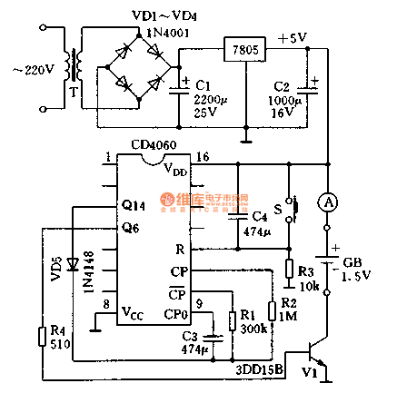 The DC 5V power supply is added to the positive electrode port of the battery GB through the ammeter to produce the 500mA interval-type charging current. After charging about one hour and a half, the high level which is output by pin-3 of CD4060 makes the oscillator stop working through the diode VD5, at this time, the Q6 outputs the low level, the power tube V1 cuts off, the charging stops. If you want to charge the other batteries, you just need to reopen the power or press the reset button S.