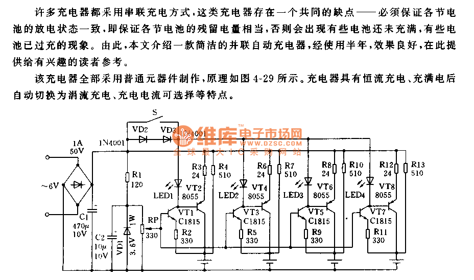 A lot of chargers use the series charging mode, these chargers have a common shortcoming--you need to guarantee that every battery has the same residual power, otherwise some batteries are overcharging but some batteries are insufficient charging. So this artical introduces one kind of concise parallel automatic charger which has good effect.