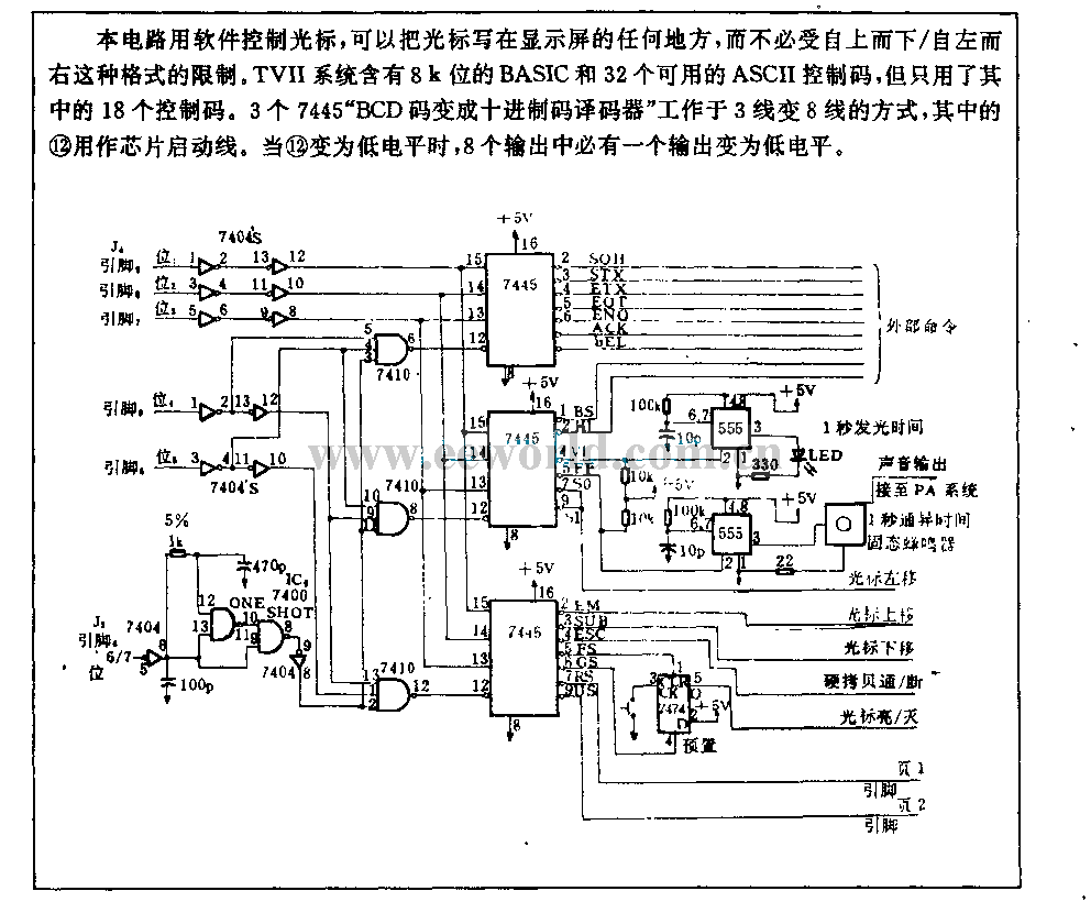 This circuit uses software to control cursor, then the cursor can be writen at any place of display screen, it is not limited by the form of from above to below or from left to right. TVII system contains 8K bits BASIC and 32 usable ASCII control codes, but only 18 codes are used. Three 7445 BCD code changes into BCD decoder work as the way of 3 lines change into 8 lines, the (12) is used as chip start-up line. When the (12) is low level, there must be a output turning into low level.