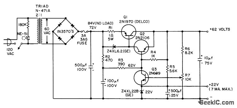Designed for output currents up to 2 amp average or 3.5 amp peak. Output voltage can be adjusted from 45 to 65 v by R7. Ripple is less than 1 my rms at no load, increasing to 60 my peak-to-peak at 2 amp. Regulation is 2.1% at 2 amp and 0.72% at 1 amp.- Transistor Manual, Seventh Edition, General Electric Co., 1964, p 228.
