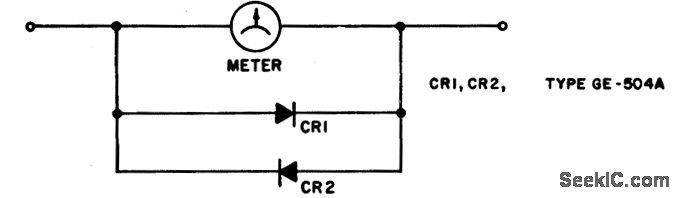 DC meter protection circuit. The diodes will not conduct until the voltage across the meter reaches 0.5 to 0.7 volts. For a typical meter movement with an internal resistance of 1200 ohms and a full-scale current rating of 50 μA the rectifiers will introduce less than 1% error (courtesy General Electric Company).