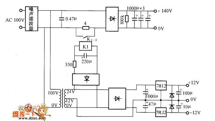 Figure shows the DC power supply circuits. AC 100V voltage is converted into a 140V DC voltage after it is commutated by the bridge rectifier and smoothed by smoothing capacity (3 1000μF capacitor in parallel), and the DC voltage is the main circuit power supply. AC 100V voltage offer stable ±12V power supply for control circuit after it is steped down by transformer,commutated by the bridge rectifier and smoothed by smoothing capacity,then regulated by 7812 and 79L12.The circuit adopts relay K1 to prevent impulse current at the moment when the power is connected.At this time,the relay K1 will stop contact K1-1, and add 4 Ω current-limiting resistor to the circuit.