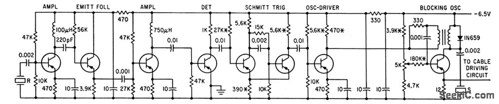 Sonic pulse produced by transducer s is sent along fixedlength water path at any depth and picked up by receiving transducer R. Received signal is then amplified and fed back to blocking oscillator to synchronize it at repetition rate determined by delay time of pulse in water. Pulses then go to cable-driving circuit, and through cable to surface vessel for counting.-L. Dulberger, Deep-Ocean Velocimeter Aids Sonar Systems Design, Electronics, 34:22, p 41-43.