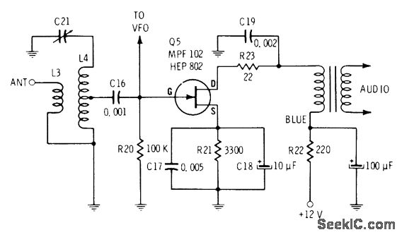 Antenna is matched to high-impedance gate input of JFET with resonant input transformer. Demodulating carrier is applied to same gate. RC filter and audio transformer in output circuit of JFET recover demodulating audio while filtering out RF signals and undesired mixing components.-E. M. Noll, FET Principles, Experiments, and Projects, Howard W. Sams, Indianapolis, IN, 2nd Ed., 1975, p 155.