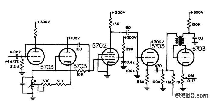 Uses switched Hartley oscillator, pentode amplifier-shaper, and series-triggered blocking oscillator to generate 20-mile distance marks in airborne search radar.-NBS, Handbook Preferred Circuits Navy Aeronautical Electronic Equipment, Vol. 1, Electron Tube Circuits, 1963, p N8-2.