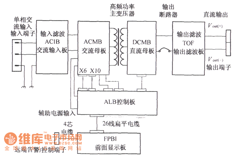 DMA12 intelligent switch rectifier module by the ac input board (ACIB), the exchange motherboard (ACMB), dc motherboard (DCMB), output filter plate (TOF), control panel (propagated), shown earlier (FPBI) six boards printed circuit board and input/output plugs, circuit breakers, inductance and transformer etc, as shown.