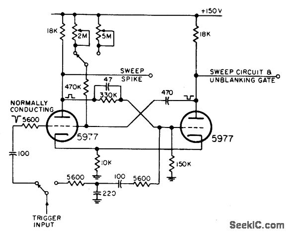 Uses both cathode and plate-to-grid coupling, with gate length changed by switching of potentiometers. Differentiated negative gate from delay mvbr is applied as trigger to grid of normally conducting tube if undelayed range sweep is desired, or to grid of normally-off tube when delayed sweep is used.-NBS, Handbook Preferred Circuits Navy Aeronautical Electronic Equipment, Vol.1, Electron Tube Circuits, 1963, p N10-3.