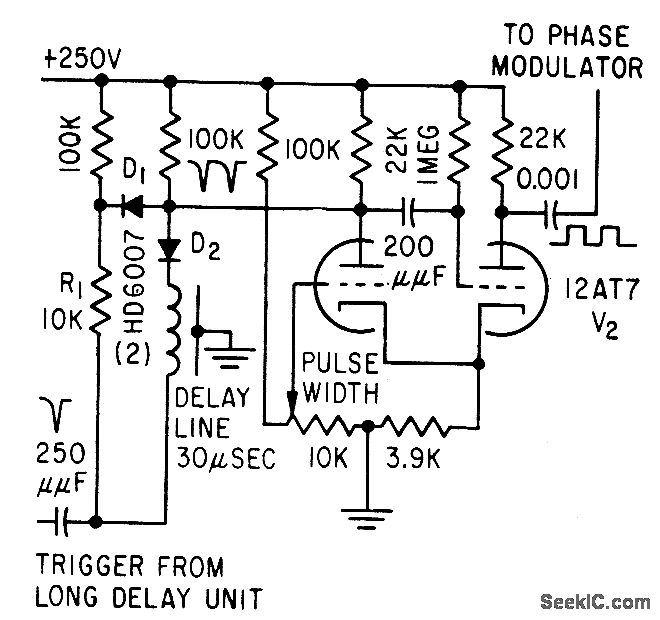 Used in responder-interrogator range computer to produce pair of 15-microsec-wide pulses spaced 30 microsec. Monostable mvbr receives two triggers, one through 30-microsec delay line, and produces 15-microsec pulse for each trigger received.-H. Vantine, Jr., and E.C. Johnson, Modified Transceivers Compute Distance, Electronics, 31:37, p 94-98.