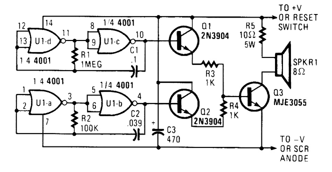 An outside horn-type speaker works best with the circuit. However, such devices require a great deal of power, so this sounder should only be used in alarm circuits where at least a 6-A SCR is used as the sounder driver.A single CMOS 4001 quad 2-input NOR gate, two 2N3904 general-purpose npn transistors, and a single MJE3055 power transistor combine to generate a two-tone output. Gates UI-a and UI-b are configured as a simple feedback oscillator with R2 and C2 setting the oscillator's frequency. With the values shown, the circuit oscillates at about 500 Hz.Gates U1-c and U1-d are connected in a similar oscillator circuit, but they operate at a much lower frequency. The oscillator frequencies (and thus the tones that they produce) can be altered by increasing or decreasing the values of R1 and C1 for the low-frequency oscillator and R2 and C2 for the high-frequency oscillator. Decreasing the values of those components will increase the frequency; increasing their values will decrease the frequency.The two oscillator outputs are connected to separate amplifiers (configured as emitter follow-ers), whose outputs are used to drive a single power transistor (Q3, an MJE3055). A 10-Ω, 5-W re-sistor, R5, is used to limit the current through the speaker and Q3 to a safe level. To boost the sound level, R5 can be replaced with another speaker.