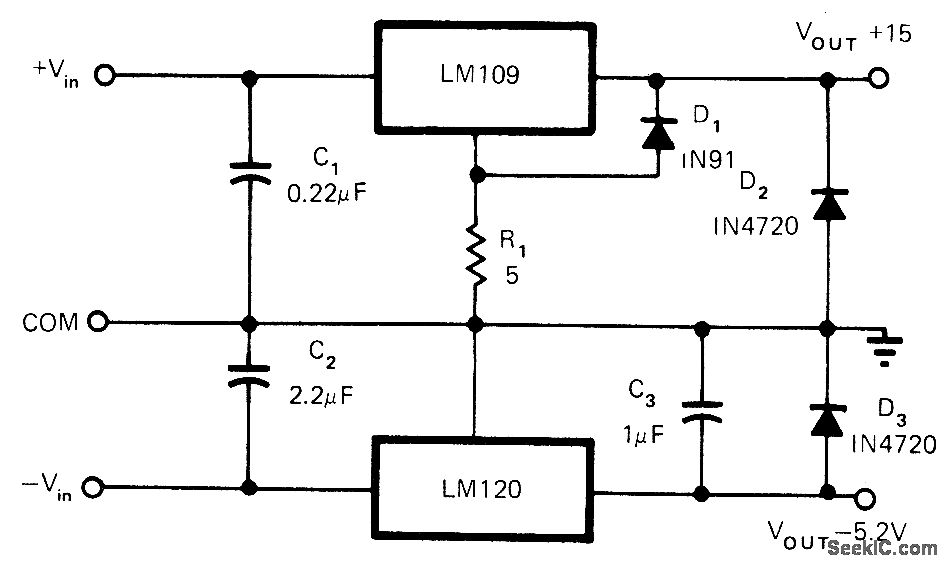 Output voltages are equal to preset values of regulator ICs in basic arrangement shown. R1 and D1 ensure startup of LM109 when common load exists across sup-plies. D1 should be germanium or Schottky hav-ing forward voltage drop of 0.4V or less at 50 mA. D2 and D3 protect against polarity reversal of output during overloads.-C. T. Nelson, Power Distribution and Regulation Can Be Simple, Cheap and Rugged, EDNMagazine, Feb, 20, 1973, p 52-58.