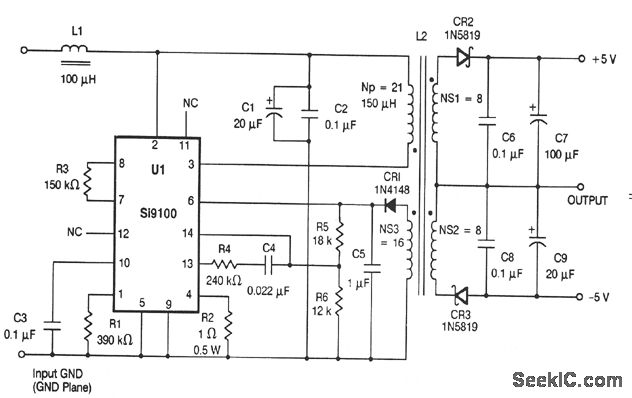 This circuit is similar to that of Figs. 4-22 and 4-24, except that there is no provision for extenal sync. The input voltage is 15 to 70 V. Typical maximum loads are 167 mA at +5V, and 33 mA at -5V. Typical minimum loads are 32 mA at + 5 V and 8 mA at -5 V. Maximum ripple is 100 mVpp. Regulation is ±5%. L1 is any 100-μH 75-mA inductor. L2 is GFS Manufacturing #85-787-4.