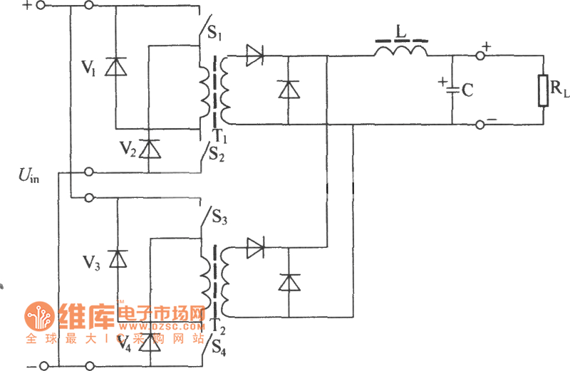 When need larger output power, generally adopt the double normal shock type conversion circuit of voltage overlay, as shown. Circuit features: (1) two normal shock type conversion circuit in parallel, T1 and T2 inverting 180 o drive, a doubling of the power and output frequency doubled, ripple and dynamic response is improved; (2) the series S1, S2, S3, S4 series), switch tube pressure by half; (3) to cancel the feedback coil, V1, V2, VpV4 are can feed path, reduce the production technology of transformer and other requirements; (4) with dead zone limit, features two parts there is no common mode circuit conduction problem, and high reliability. Characteristic: normal shock: conduction type feeder to load, when the time L power supply to the load. Pressure: single pipe is excited, maximum voltage switch tube is 2 uin. Two pipe is shock: switch tube maximum voltage for Uin. : transformer utilization rate is not high (only using the first quadrant hysteresis loop), the production process to add on the feed can coil. Purpose: because the two pipe is shock parallel circuit has big output power, output pulse frequency doubling, easy to filter, switch tube pressure by half (about the input voltage Ui. , so widely used in high power conversion circuit, is considered to be high reliability at present, manufacturing is not the main circuit of a complex.