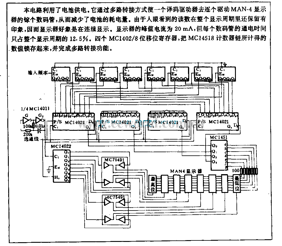 This circuit uses battery powered. It makes an encode driver to drive LEDs of MAN-4 display one by one through multi-channel transit way, then to reduce the power consumption of battery. Because the reading which people seen is still have impression in whole display cycle, so the display seem to display continuously. The peak current of display is 20mA, the test duration of each LED only accounts for 12.5% of the whole display cycle. Four MC1402/8 FCSR, to latch the value which is form MC14518 count chain,then itaccomplishes the multi-channel transit function.