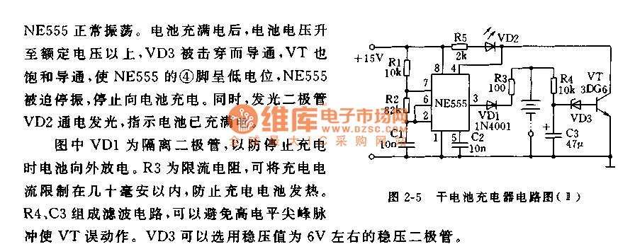 The dry cell charger circuit is as shown in figure 2-5. The low-frequency multivibrator is composed of the NE555 and the external components R1,R2,C1, when the voltage of pin-3 is the high level, you can charge the four dry cells through VD1 and R3. The oscillation frequency of the oscillator is decided by R1, R2, C1, according to the data of the figure, the oscillation frequency is about 80Hz, the electrical level of pin-3 changes with this 80Hz frequency.