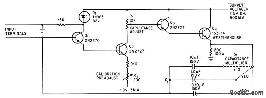 Two-terminal circuit provides capacitance values from 0.1 to 100 mfd, continuously variable in three ranges. Voltage ratting is +10 v and frequency range is d-c to 45 cps. Used in low-pass RC filter with adjustable cutoff frequency, in waveform analyzer.—D.L. Bergman, Electronic Capacitor is Continuously Variable, Electronics, 38:21, p 89