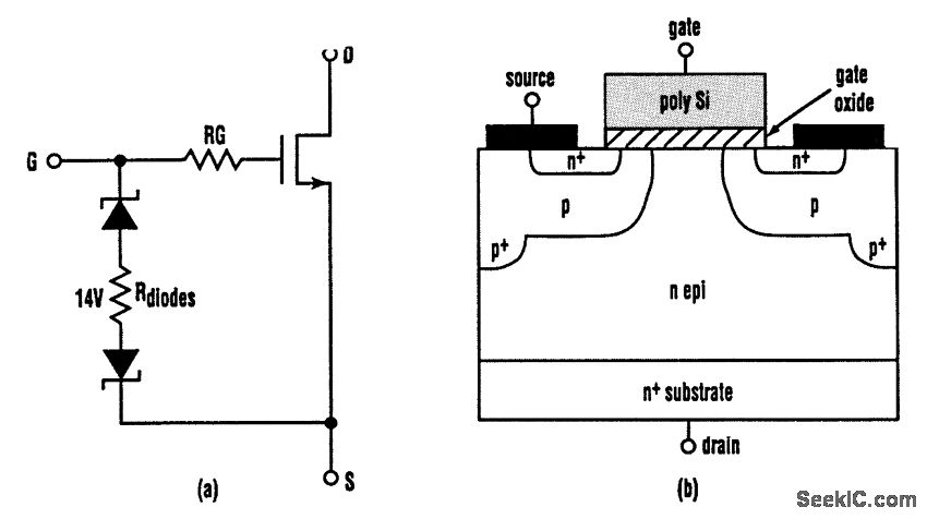 A simple way to protect the gate of a power MOS device is to place back-to-back zener diodes between the device's gate and source (a). The breakdown voltage of the zeners is chosen to be less than the oxide-rupture voltage so that the ESD transient cannot harm the gate. The resistance of the clamp diodes must be kept to a minimum because ESD transients can have high peak currents (in amps), and the voltage appearing at the gate will be the sum of the zener breakdown voltage and the IR voltage drop across the diode resistance. The machine model (MM) is particularly stressful because there is no resistance to limit the current. Along with the diodes, the resistor (RG) is added to improve MM performance. RG prevents the gate of the MOSFET from charging to a dangerous voltage level during the time the ESD transient is dissipated by the diodes. A machine model here is defined as a 200-pF capacitor with no series resistance.