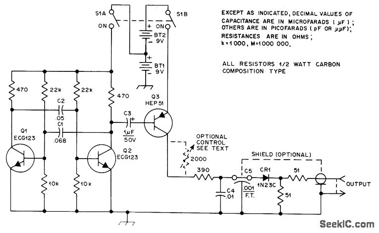 Develops about 18 dB of excess noise in region of 50-300 MHz for optimizing converter or receiver for best noise figure. Can also be used for noise optimizing of TV receivers and for peaking UHF TVfront ends. Q1 and Q2 form cross-coupled 7OO-CR1 MVBR. C1 is greater than C2 to favor conduction of Q2. When Q2 is on, Q3 turns on and makes current flow through broadband noisediode CR1. Diode is forward-biased because available gating voltage does not generate enough noise in reversebias mode. If noise output is too great, insert 20000-ohm attenuator as shown.-T. E. Hartson, A Gated Noise Source, QST, Jan. 1977. p 22-23.