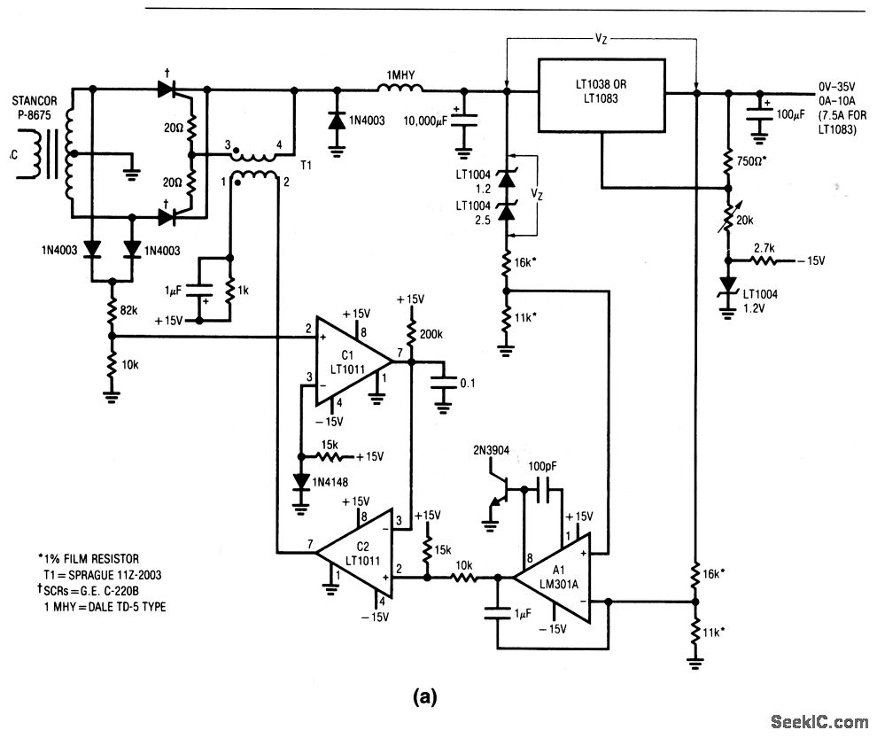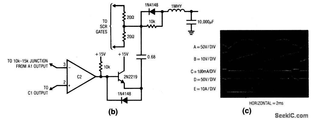 This ac-powered circuit provides 0- to 35-V, 10-A regulation under high-low (90 to 140 Vac) conditions. The transformer output is diode rectified (trace A, Fig. 9-10C), divided down, and used to reset the 0.1-μF capacitor (trace B) via C1. The resulting ramp at C1 is compared to the A1 output by C2. When the ramp exceeds the C2 noninverting input value, C2 goes low and dumps current through the T1 primary (trace C). This fires the appropriate SCR and creates a path from the main transformer to the LC filter (trace D). The resultant current flow (trace E) is limited by the inductor and charges the capacitor. When the ac line cycle drops low enough, the SCR commutates and charging ceases. Figure 9-10B shows a way to trigger the SCRs without a transformer.