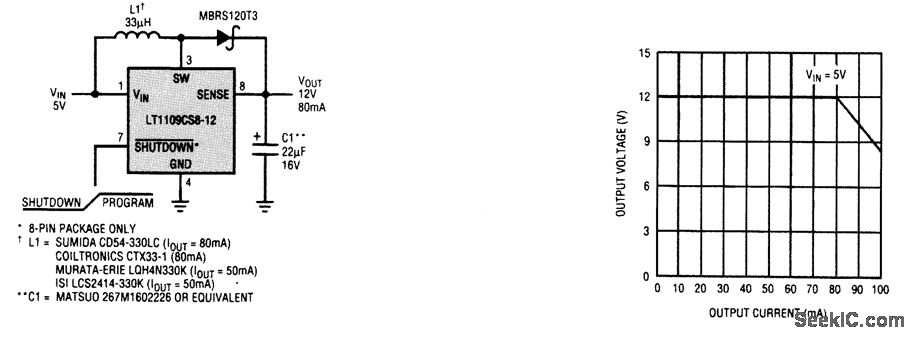 Generating 12 V for flash memory programming is a common requirement in portable systems and PCMIA cards. The LT1109-12 dc-to-dc converter simplifies this task and uses only 0.75 in2 of PC board space. The LT1109-12 is offered in an eight-lead SO package and requires only three other surface-mount components to construct a complete 12-Vpp generator. At 12 V, 60 mA of programming current is produced, enough for simultaneous programming of two flash memories. The circuit draws 320 μA (max.) of standby current while shut down and provides a clean transition from 5 to 12 V at its output with no overshoot.