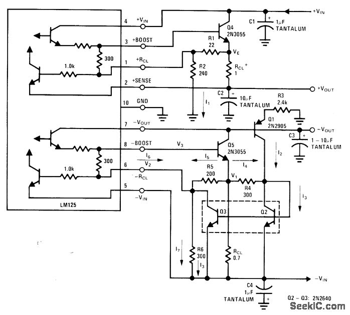 Reduces short-circuit output current of National LM125 dual tracking regulator sections to fraction of full-load output current, avoiding need for larger heatsink. Programmable current source is used to give constant voltage drop across R5 for negative regulator. Simple resistor divider serves same purpose for positive regulator. Design examples are given.-T. Smathers and N. Sevastopoulos, LM125/LM126/LM127 Precision Dual Tracking Regulators, National Semi-conductor, Santa Clara, CA, 1974, AN-82, p7.