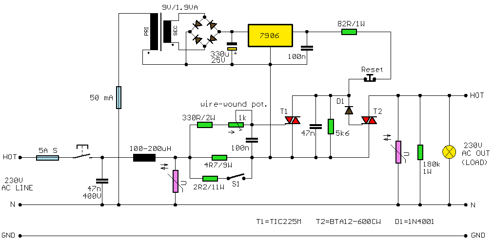 A fast electronic fuse designed to operate on 230V AC with an adjustable trip current.