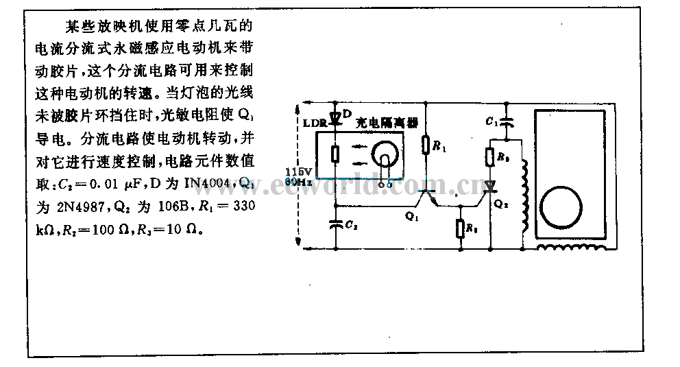 Some movie projectors use a few watts current separator permanent magnet induction motor to drive film, this divided circuit is used to control the rotational speed of motor. When the light is not blocked by film loop, photosensitive resistance makes Q1 conductive. Divided circuit makes motor flip, and also control its speed, circuit elements numerical take: C2=0.01μF, D is IN4004, Q1 is 2N4987, Q2 is 106B, R1=300kΩ, R2=100Ω, R3=10Ω.